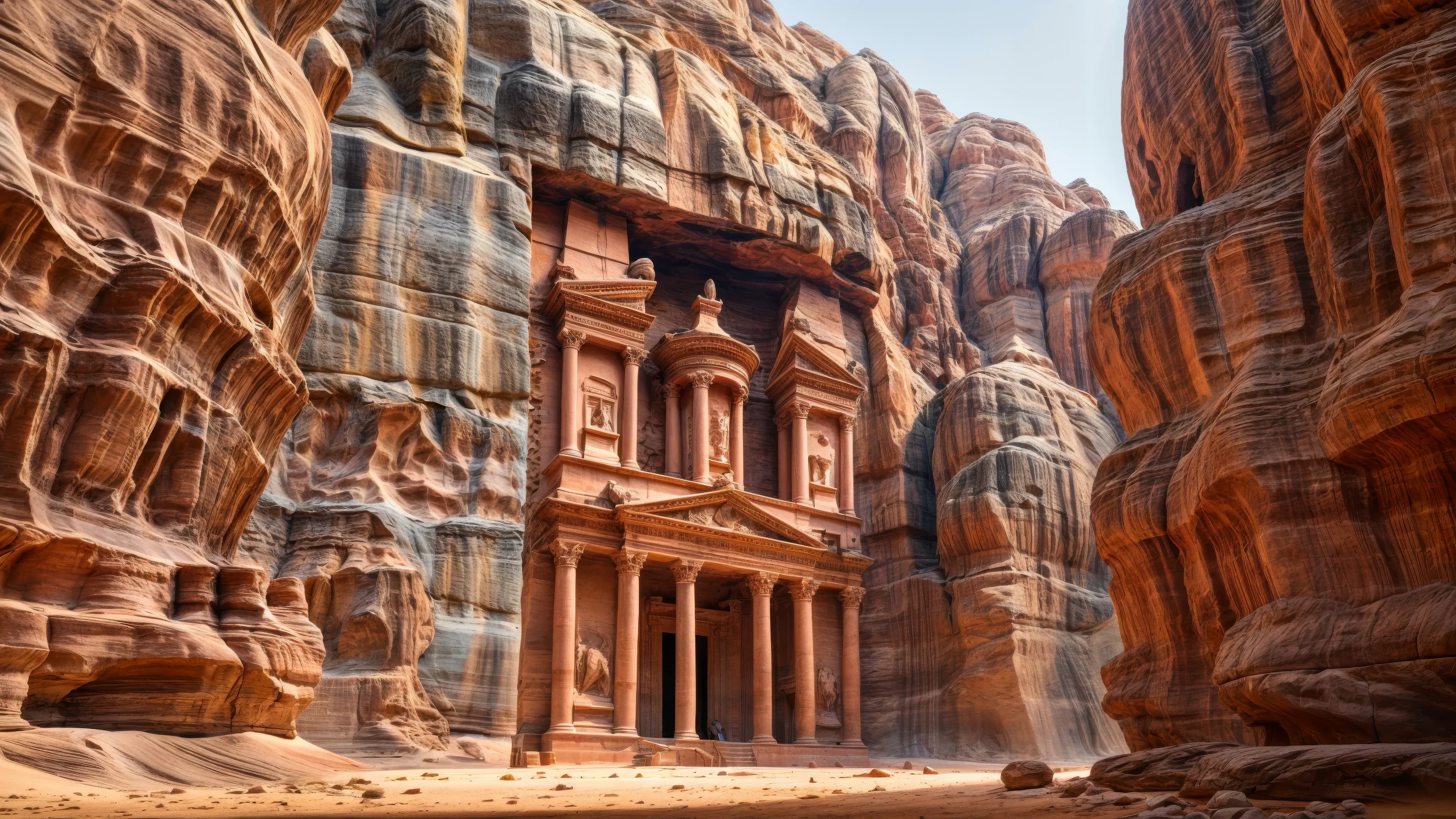 Petra’s architecture is a blend of Eastern traditions and Hellenistic influences, resulting in a unique and stunning style. The buildings are directly carved into the cliff faces using chisels, with the most famous structure being Al-Khazneh (The Treasury). Standing over 40 meters high, it is adorned with Corinthian capitals, friezes, and figures. Other notable structures include the Monastery, the Royal Tombs, and the Great Temple, all demonstrating the remarkable craftsmanship of the Nabateans.