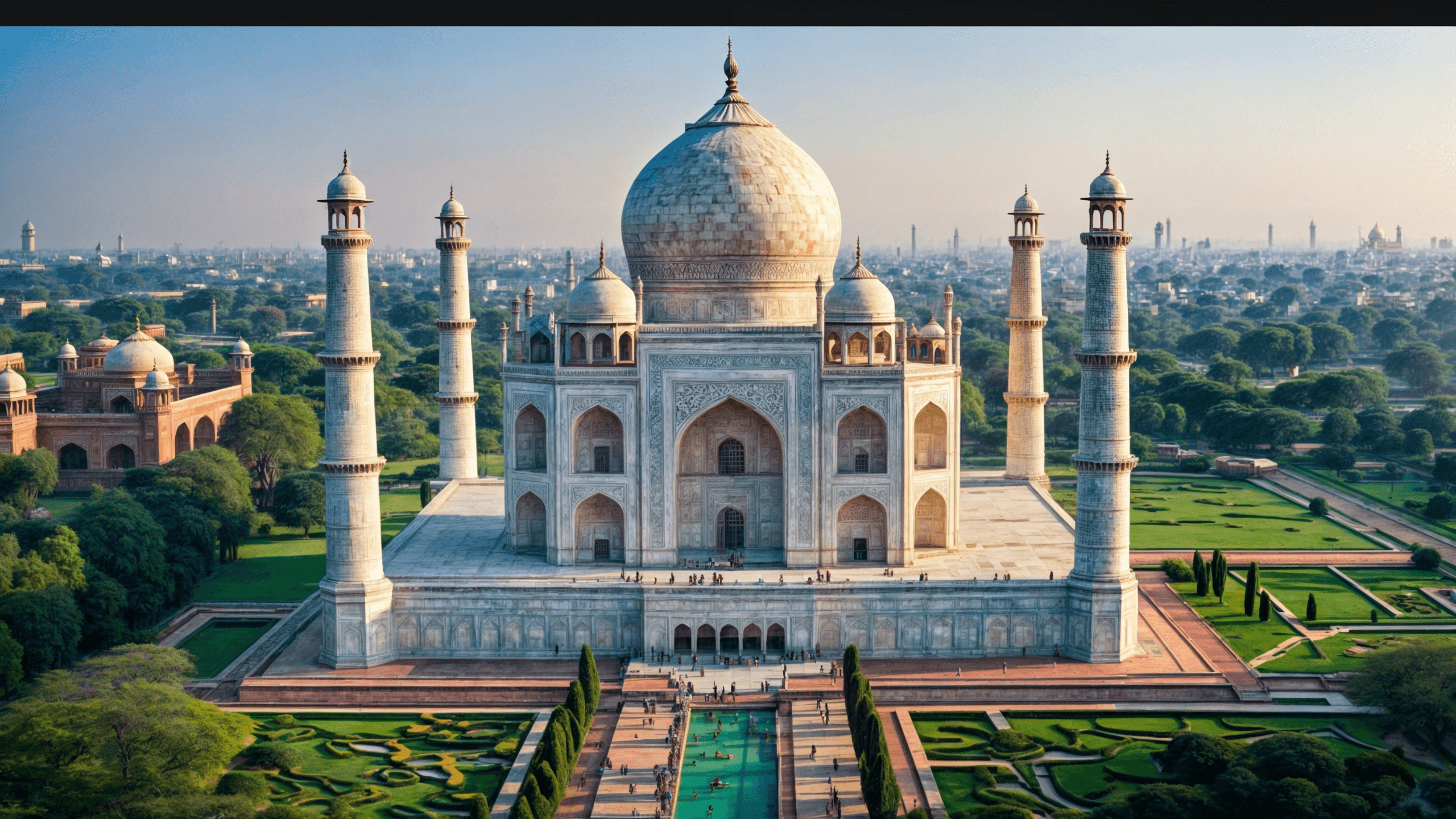 The Taj Mahal, located in Agra, India, is a stunning mausoleum erected between 1632 and 1653 by the Mughal emperor Shah Jahan in honor of his beloved wife Mumtaz Mahal, who passed away during childbirth. The monument, a testament to the grandeur of Mughal architecture and the depth of Shah Jahan's love, stands on the southern bank of the Yamuna River, surrounded by lush gardens and other architectural wonders.