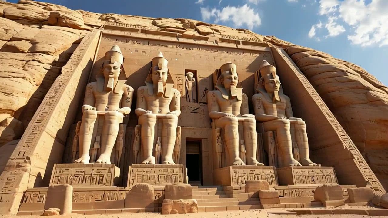 The Temple of Ramses at Abu Simbel is a monumental temple complex located in southern Egypt, near the border with Sudan. It was commissioned by Ramses II, one of the most powerful and celebrated pharaohs of ancient Egypt. The temple was built to commemorate his victory at the Battle of Kadesh and as a monument to himself and his queen, Nefertari. It was constructed from around 1264 BC to 1244 BC, during the 19th Dynasty of the New Kingdom period.