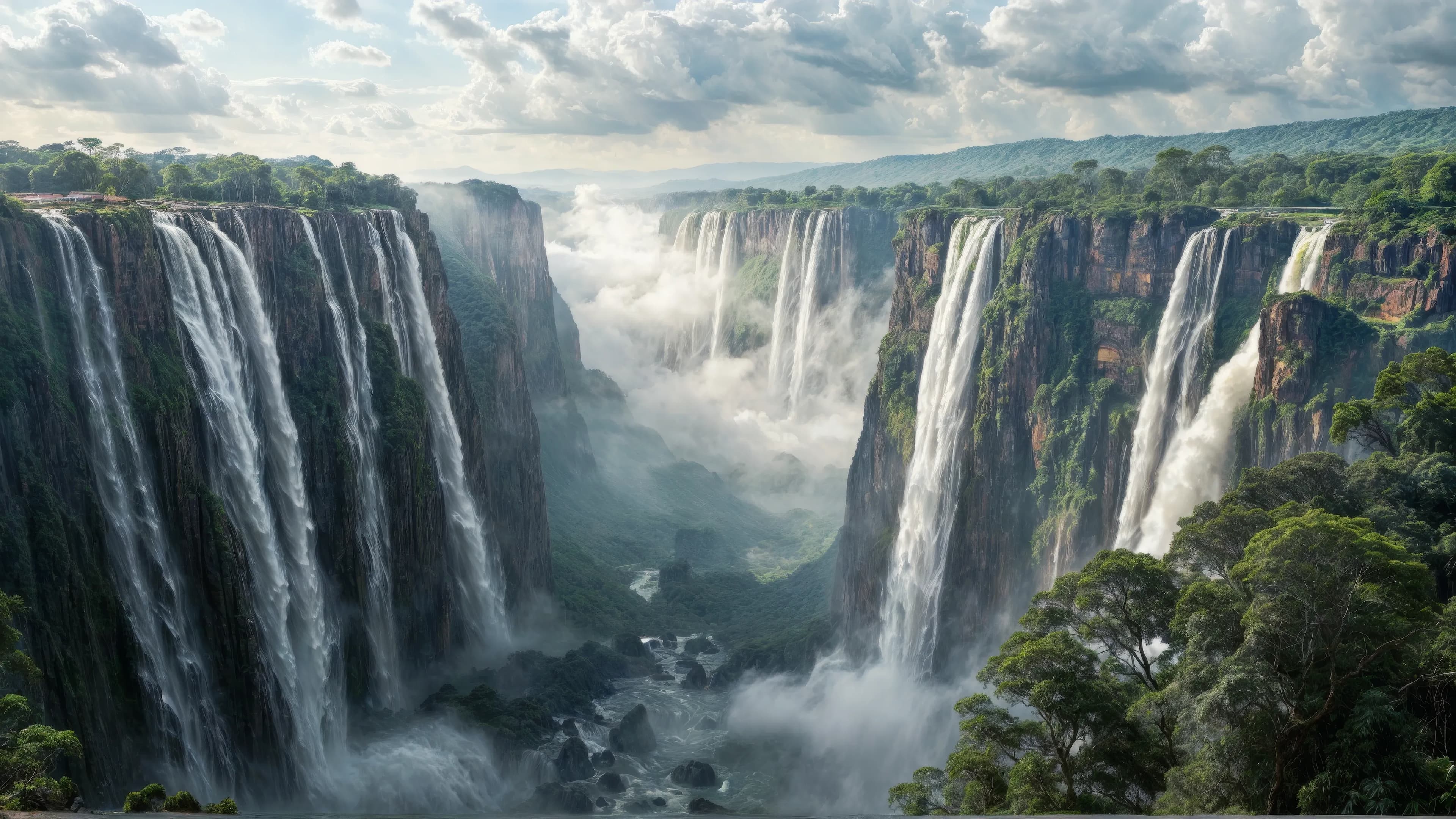 Victoria Falls is a natural wonder, sculpted by geological processes over millions of years. It is approximately 1.7 kilometers wide and 108 meters high. During the flood season, an incredible amount of water cascades over the edge into the Zambezi Gorge below, creating a mist that can be seen from more than 20 kilometers away. The falls are formed by a natural fault line, which means they are divided into four segments: the Main Falls, Rainbow Falls, the Eastern Cataract in Zambia, and the Devil's Cataract in Zimbabwe.