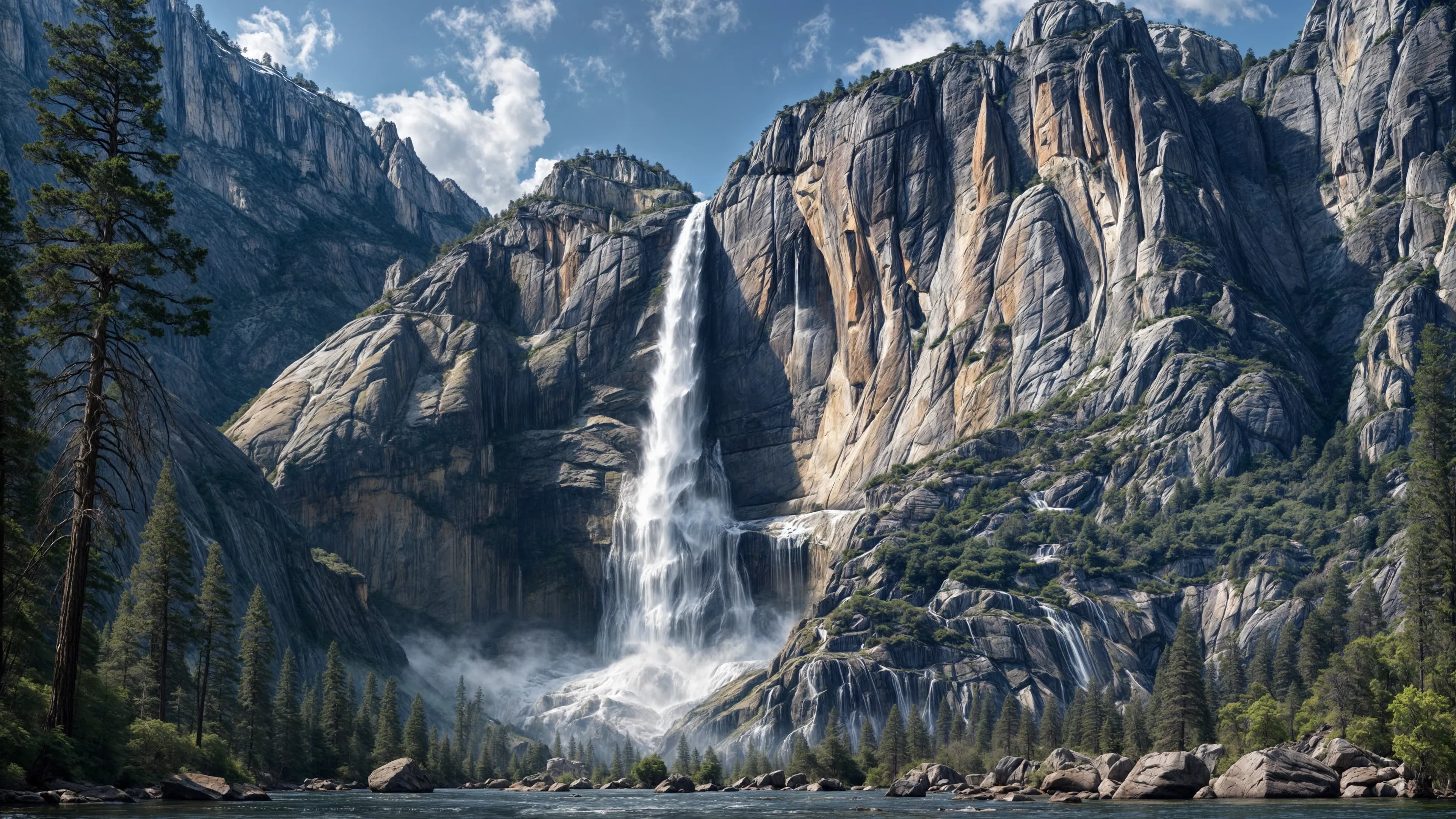 Yosemite Falls is one of the highest waterfalls in the world. Its water flow varies with each season, being most spectacular during spring when the snow melts. Despite its steep drop, the water of the falls does not reach the ground as one continuous stream. Instead, it breaks into a series of smaller cascades and mist, creating a mesmerizing display.