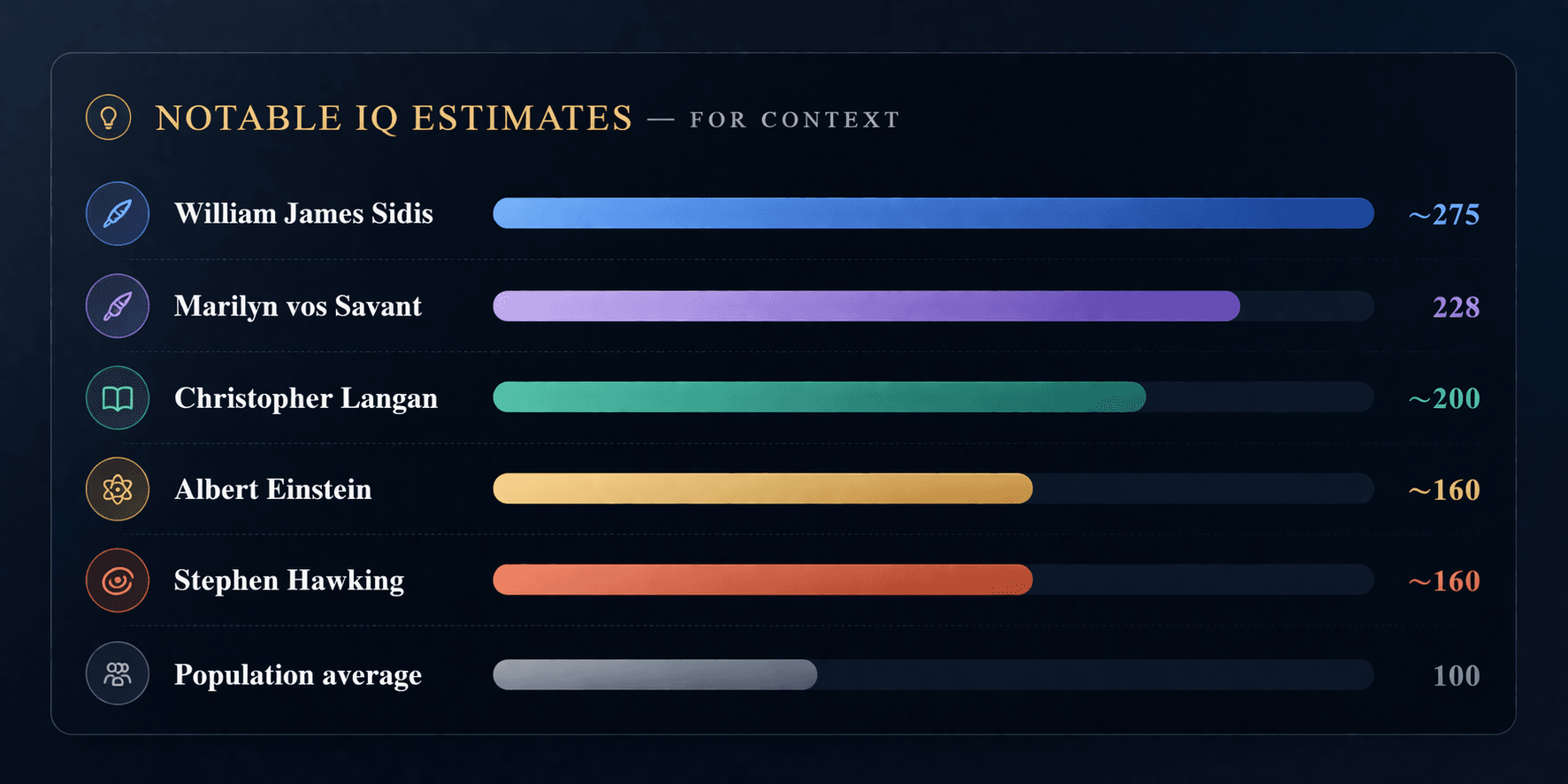 The case of Christopher Langan — sometimes called "the smartest man in America," with a reported IQ between 195 and 210 — illustrates the problem vividly. Despite his extraordinary scores, Langan has publicly promoted September 11th conspiracy theories and white replacement ideology, leading some commentators to describe him, memorably, as "Alex Jones with a thesaurus."